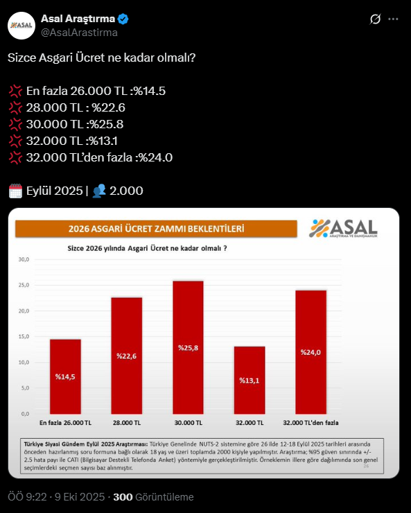 Asal Araştırma tarafından 12-18 Eylül tarihleri arasında 26 ilde yapılan ankette 2 bin katılımcıya, “Sizce 2026 yılında asgari ücret ne kadar olmalı?” sorusu yöneltildi.