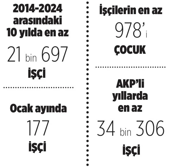 2014-2024 arası 10 yılda ise en az 21 bin 697 işçi alınmayan önlemler ve ihmal yüzünden çalışırken hayatını kaydetti. AKP’nin iktidara geldiği 2002 yılından bu yana yaşanan iş cinayeti sayısı ise en az 34 bin 306. 34 bin 306 iş cinayetinin en az 978’inde ise çocuklar hayatını kaybetti.