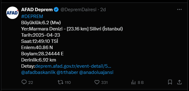 İstanbul‘da art arda şiddetli deprem meydana geldi. AFAD depremin büyüklüğünü 6,2 olarak açıkladı.