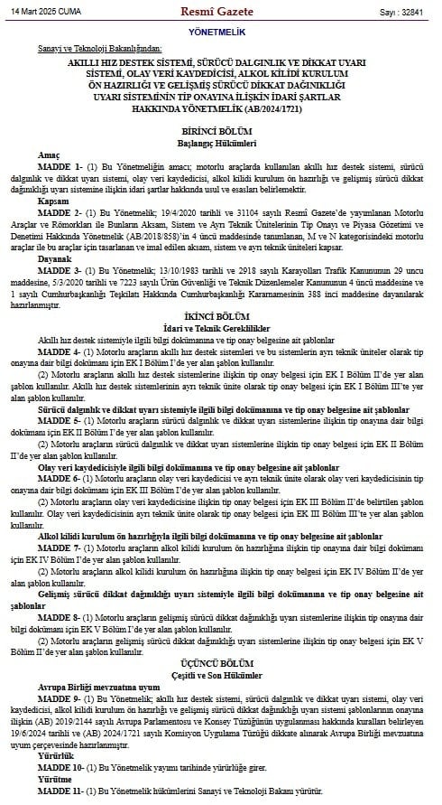 Daha önce yayımlanan yönetmelikte, akıllı hız destek sistemi, sürücü dalgınlık ve dikkat uyarı sistemi, olay veri kaydedicisi ve gelişmiş sürücü dikkat dağınıklığı uyarı sistemlerinin idari esasları belirlenmişti. Yeni düzenleme ise Avrupa Birliği mevzuatına uyum çerçevesinde hazırlandı ve motorlu araçlarda güvenlik standartlarını yükseltmeyi amaçlıyor.