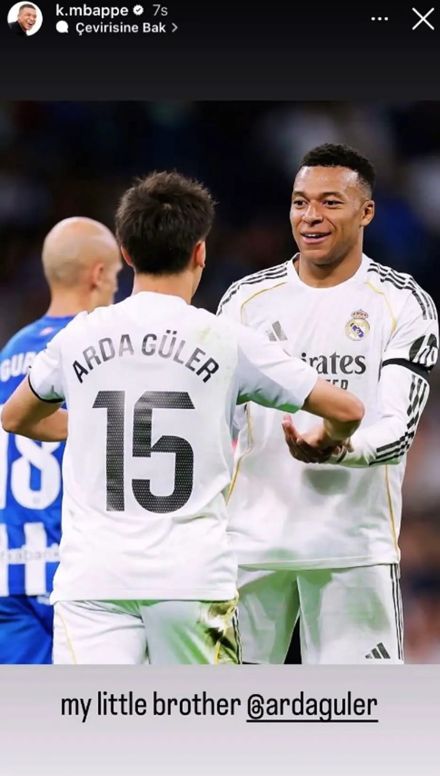 Paylaşımına Arda Güler’le fotoğrafını koyan Mbappe, altına da “Benim küçük kardeşim” diye yazdı.