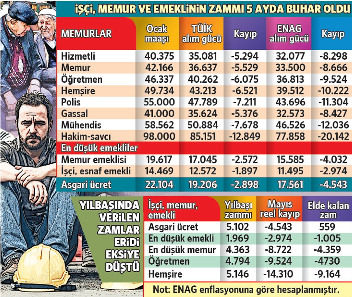 İktidarın memur, işçi ve emekliye yıl başında verdiği zamlar 5 ayda buhar oldu. Milyonlarca memur ve emeklinin aldığı zam enflasyon karşısında tamamen tükenip eksiye geçti. Asgari ücretin alım gücü mayıs sonu itibarıyla TÜİK enflasyonuna göre 19.206 liraya, ENAG enflasyonuna göre de 17.561 liraya düştü.