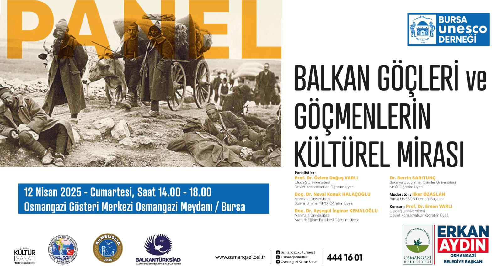 Bursa UNESCO Derneği, Balgöç, Rumelisiad, Balkantürksiad ve Osmangazi Belediyesi ortaklaşa etkinliğinde Osmangazi kültür merkezinde gerçekleştiriken panelde Osmanlının hüküm sürdüğü 550 yıllık sürede imar ettiği, Huzur ve refah sağladığı Rumeli coğrafyasında 1821 mora isyanıyla başlayan ve 1989 a kadar süren göçler, kaybedilen savaşlar, yaşanan dramlar, Osmanlının 550 yıl süresince yaptığı 80.000 civarındaki imaretler, göçmenlerin yaşam kültürleri, örf adet ve gelenekleri yani Somut ve Somut olmayan kültürel mirasları masaya yatırıldı.Panele ilgi büyüktü Akademisyen panelistler Prof.Dr.Özlem Doğuş VARLI, Prof.Dr.Ersen Varlı, Doç.Dr.Neval Konuk HALAÇOĞLU, Doç.Dr.Ayşegül İnginar KEMALOĞLU, Dr.Berrin SARITUNÇ yer aldılar.Panelin Moderatörlüğünü UNESCO Derneği Başkanı ilker ÖZASLAN yaptı.Türk Dil Tarih kurumu eski başkanı Prof.Dr.Yusuf Halaçoğlu, Osmangazi Belediye Başkanı Erkan Aydın,Chp il başkanı Nihat Yeşiltaş, Mimarlar Odası Bursa Şube Başkanı Şirin Rodoplu Şimşek, Eski Bursa B.şehir Bldy.Başk.Recep Altepe çeşitli Stk Başkan ve üyeleri ve çok sayıda davetli katıldı.Panelde Uludağ Ün.Devlet konservatuarı öğretim görevlileri Prof .Dr.Özlem Varlı ve Prof.Dr.Ersen Varlı hocalar Rumelinin çeşitli yörelerinden derledikleri eserler ile kısa bir konser verdiler.14.00 de başlayan panel 18.30 da sona erdi.