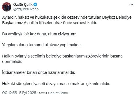 “Aylardır, haksız ve hukuksuz şekilde cezaevinde tutulan Beykoz Belediye Başkanımız Alaattin Köseler biraz önce serbest kaldı.