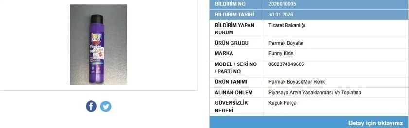 Yapılan denetimler kapsamında Bakanlık, Funney Kids markalı parmak boyanın kullanımının güvensiz olduğunu tespit etti.