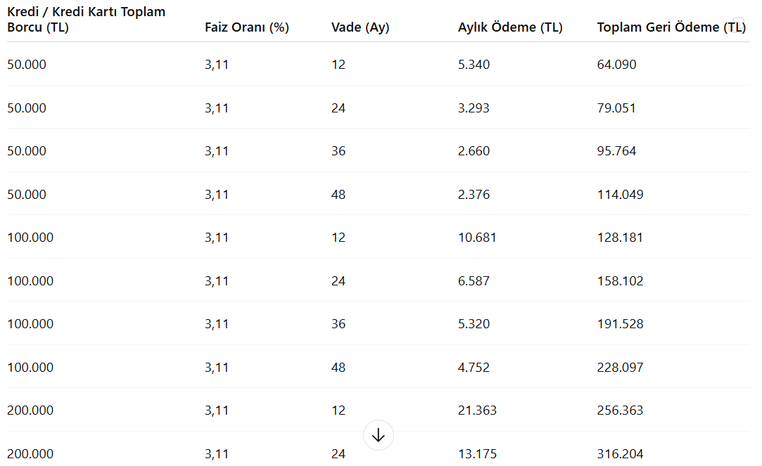 Borç tutarına göre aylık ödeme örnekleri de paylaşıldı. Buna göre 50 bin liralık kredi veya kredi kartı borcu, 12 ay vadeyle yapılandırıldığında aylık ödeme yaklaşık 5 bin 340 lira olurken, 100 bin liralık borç için aylık taksit 10 bin 681 liraya çıkıyor. 500 bin liralık borçta aylık ödeme 53 bin 409 lira seviyesinde hesaplanırken, 1 milyon liralık borcun aylık taksiti yaklaşık 47 bin 520 lira olarak belirtiliyor.