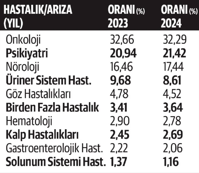 SGK’nın verilerine göre, malulen emekli edilen bireylerin önemli bir kısmı kanser hastalığı ile mücadele edenlerden oluşmaktadır. 2023 yılı itibarıyla onkolojik hastalıklar nedeniyle malulen emekli edilenlerin oranı %32,89 olarak kaydedilmiştir. Psikiyatrik hastalıklar ikinci sırada yer alırken, nörolojik hastalıklar ise üçüncü sırada bulunmaktadır. Bu hastalıklara ek olarak, üriner sistem rahatsızlıkları, göz hastalıkları, kardiyovasküler problemler, sindirim sistemi hastalıkları ve solunum yolu rahatsızlıkları da malulen emeklilikte dikkate alınan diğer hastalıklar arasında yer almaktadır.