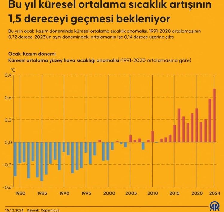 Avrupa Birliği’ne bağlı Copernicus İklim Değişikliği Servisi’nin verilerine göre, 2024 yılının Ocak-Kasım dönemi itibarıyla küresel ortalama sıcaklık, 1991-2020 yılları arasındaki ortalamanın 0,72 derece üzerine çıkarak dikkat çekici bir artış göstermiştir. Bu sıcaklık değeri, 2024 yılının 2023 yılıyla kıyaslandığında 0,14 derece daha sıcak olduğunu ortaya koymaktadır. Böylelikle, 2024 yılının en yüksek sıcaklık değerlerine ulaşarak tarihe geçmesi beklenmektedir.