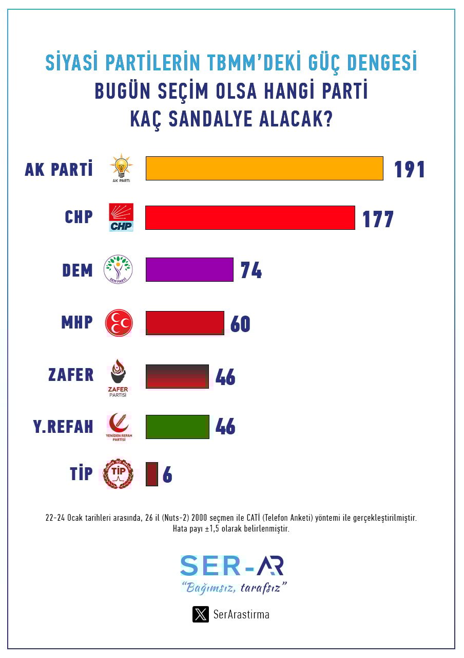 Ser Araştırma, 22-24 Ocak tarihleri arasında 26 ilde 2 bin seçmenle yaptığı anket sonuçlarını kamuoyu ile paylaştı.