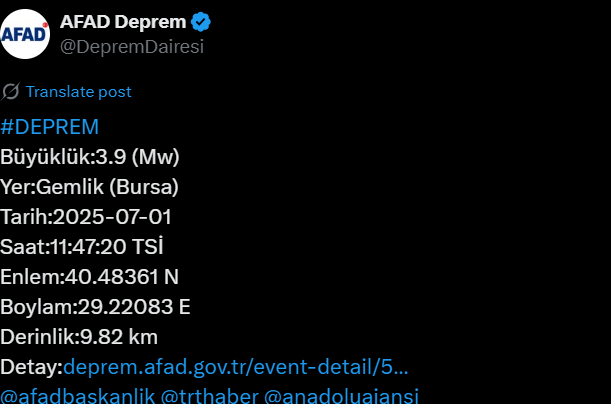 AFAD, depreme ilişkin verileri açıkladı. Açıklanan verilere göre, deprem 3.9 büyüklüğünde Gemlik-Bursa merkezinde gerçekleşti. Can ya da mal kaybı olmadığı bildirildi.