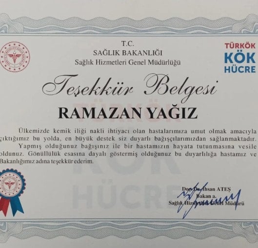 Öte yandan şehit Hava Uçak Bakım Astsubay Başçavuş Ramazan Yağız’ın, 10 yıl önce kök hücre bağışında bulunduğu, 2023 Haziran ayında Ankara Bilkent Şehir Hastanesi’nde tedavi gören kanser hastasıyla uyumlu olması sonucu ise naklin gerçekleştiği öğrenildi. Şehit Yağız, Sağlık Bakanlığı tarafından gönderilen Teşekkür Belgesi’ni ve mutluluğunu, “Bundan yaklaşık 10 sene önce kök hücre (kemik iliği) bağışçısı olmak ister misiniz sorusuna evet dedim ve 10 yıl sonra geçtiğimiz Mart ayında kanser olan bir hasta ile uyumlu olduğum haberini aldım. Çeşitli testler sonrası Haziran ayında Ankara Bilkent Şehir Hastanesi’nde nakil gerçekleşti ve 3 ayı aşkın bir sürenin sonunda bugün hastanın taburcu olduğu bilgisini aldım. Sağlık Bakanlığı’nın aldığı karar gereği hastayı tanımıyorum ama çok mutlu oldum. Rabb’im kimseyi çaresiz dertlerle imtihan etmesin inşallah” mesajıyla sosyal medyadan paylaştığı ortaya çıktı.
