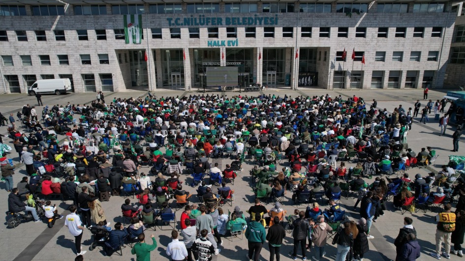 Bursaspor’un TFF 3. Lig 1. Grup’ta Artvin Hopaspor’u 2-1 mağlup ettiği karşılaşma, Nilüfer Belediyesi’nin organizasyonuyla Nilüfer Belediyesi Halk Evi önündeki Cumhuriyet Meydanı’nda dev ekranda yayınlandı. “Formanı Giy, Sandalyeni Kap Gel” sloganıyla düzenlenen etkinlik, yüzlerce taraftarı bir araya getirdi.