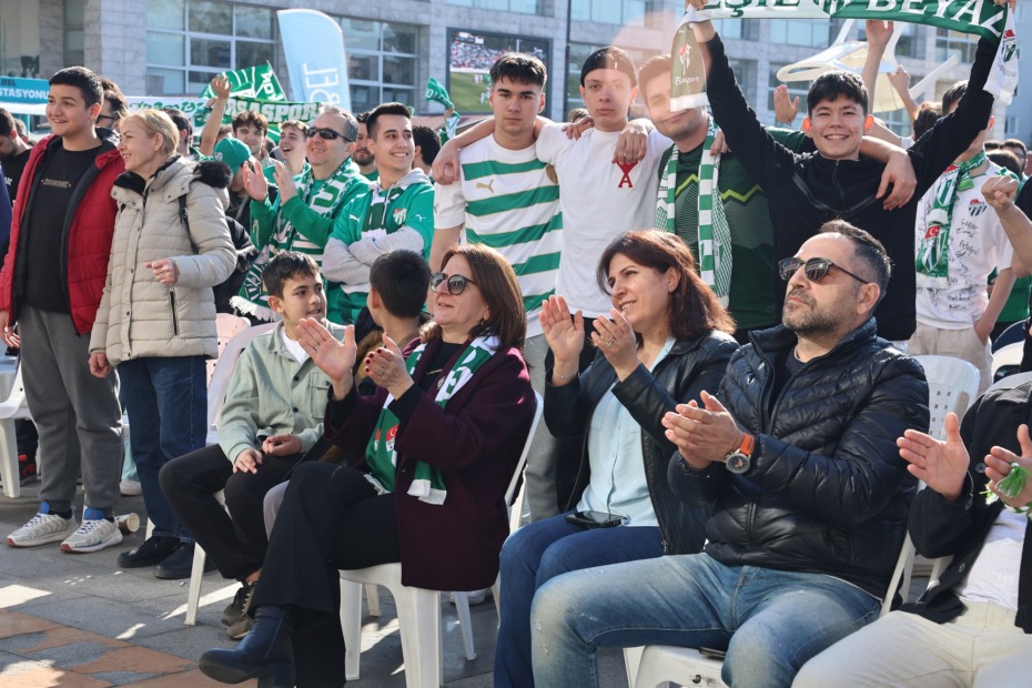 Nilüfer Belediyesi Halk Evi önündeki Cumhuriyet Meydanı, yeşil beyazlı renklere gönül veren taraftarlarla dolup taştı. Her yaştan Bursaspor taraftarının akın ettiği meydanda, şampiyonluk heyecanı hep birlikte yaşandı.