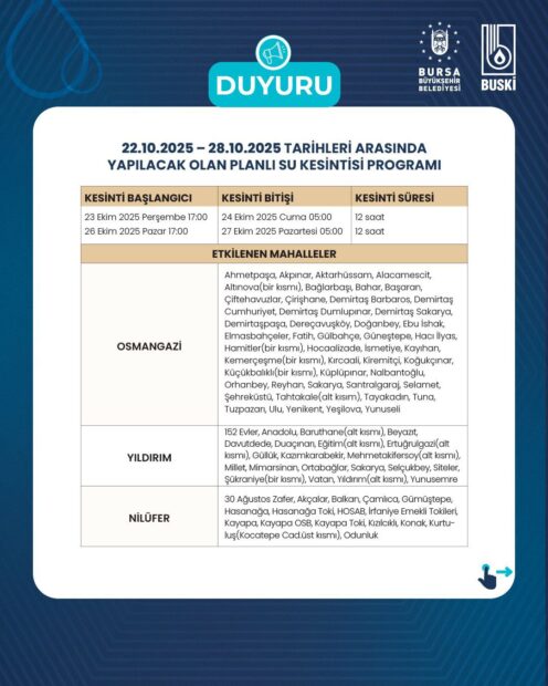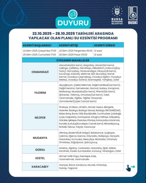 Söz konusu planlı su kesintileri, günlük 12 saati geçmemek kaydıyla, merkez ilçelere bağlı mahallelerde dönüşümlü olarak uygulanacaktır. Yapılması planlanan su kesintileri ile günlük 100 bin metreküp su tasarrufu yapılması hedeflenmektedir. Planlı su kesintilerinden Uludağ Üniversitesi, Şehir Hastanesi ve Devlet Hastaneleri etkilenmeyecektir.