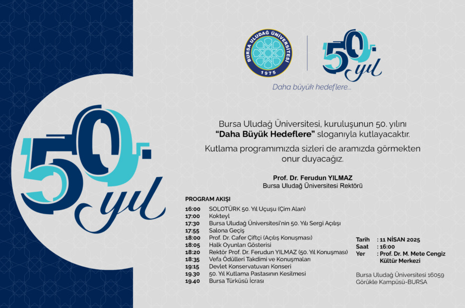 Bursa’nın ilk, Türkiye’nin önde gelen üniversitelerinden biri olan Bursa Uludağ Üniversitesi’nin 50. Kuruluş yıldönümünü coşku ile kutlamak için sene başından beri yoğun bir çaba sarf ettiklerini vurgulayan Rektör Prof. Dr. Ferudun Yılmaz; “Geniş bir ekip ile eğitim-öğretim döneminin başından itibaren kapsamlı bir program organize ediyoruz. Üniversitemizin yarım asırlık geçmişini en iyi şekilde duyurmak ve bu özel kuruluş yıldönümünü kutlamak için elimizden gelen gayreti gösteriyoruz. Yıl içerisinde çok sayıda etkinlik düzenledik. 11 Nisan olan kuruluş günümüz için ise çok daha özel bir program organize ettik. Solo Türk başta olmak üzere ilerleyen günlerde birbirinden değerli etkinliklerimiz olacak. Bursalı hemşehrilerimizi Solo Türk gösterisini seyretmek için kampüsümüze bekliyoruz. Ayrıca sonraki etkinlikler için de şehir paydaşlarımızı ve öğrencilerimizi farklı kutlama programlarına bekliyoruz” dedi.
