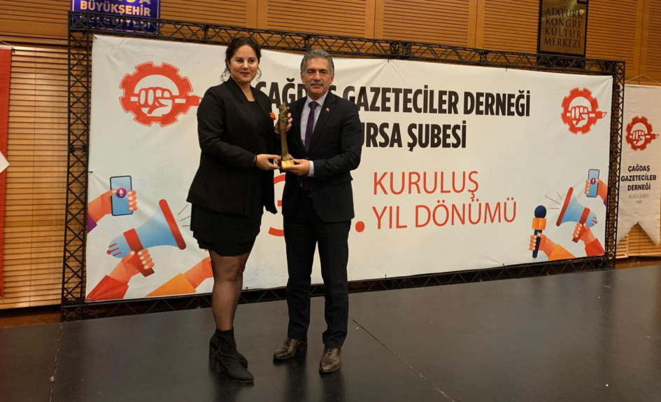 ÇGD Bursa Şubesi’nin Danışma ve Yönetim Kurulu üyelerinden oluşan jürinin belirledigi 9 kategoride 9 ödül verdi. Öte yandan geçtiğimiz yıl başarı ödülüne layık görülen ancak törene katılamayan Gazeteci Timur Soykan’a da ödülü, Çağdaş Gazeteciler Derneği Bursa Şube Başkanı Yüksel Baysal takdim etti.