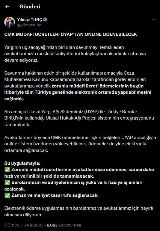 Tunc’un sosyal medya hesabından yaptığı açıklamaya göre zorunlu müdafi ücreti ödemelerinin bugün itibarıyla elektronik ortamda yapılacak.