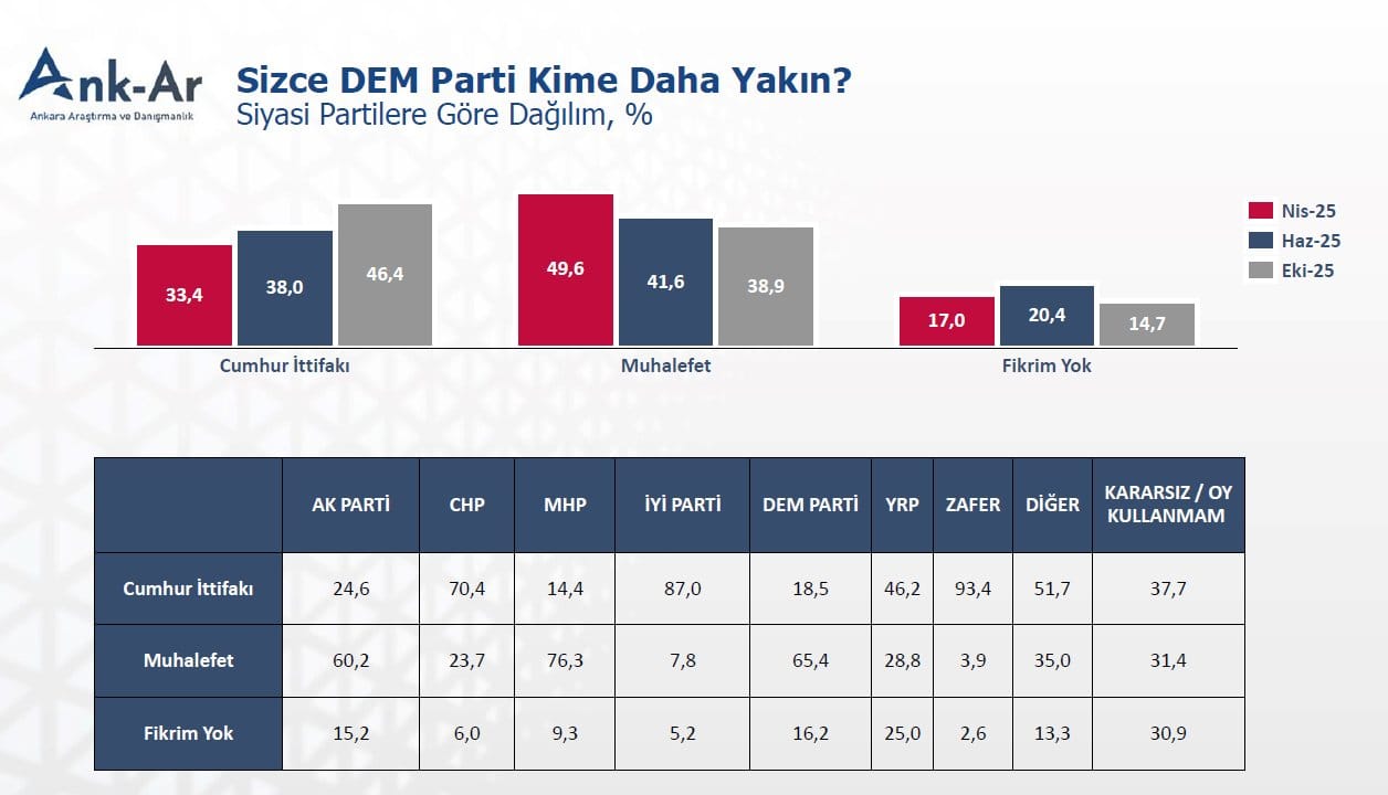 “Sizce DEM Parti kime yakın?” sorusuna hangi partinin ne yanıt verdiği ortaya çıktı. Nisan-Haziran ve Ekim aylarında yapılan ölçümlerde DEM Partinin Cumhur İttifakına daha yakın olduğunu düşünenlerin oranı düzenli bir şekilde artış gösterdi. Bu durum muhalefete yakındır diyenlerin oranında paralel bir şekilde düşüş olarak yansıdı.