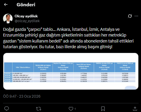 Doğal gaz faturalarında sıkça gözden kaçan “sistem kullanım bedeli”, şehirler arasındaki fiyat farklarını bir kez daha gündeme taşıdı. Gazeteci Olcay Aydilek’in sosyal medya hesabından paylaştığı tablo, Ankara, İstanbul, İzmir, Antalya ve Erzurum’daki dağıtım bedellerini karşılaştırmalı olarak ortaya koydu.