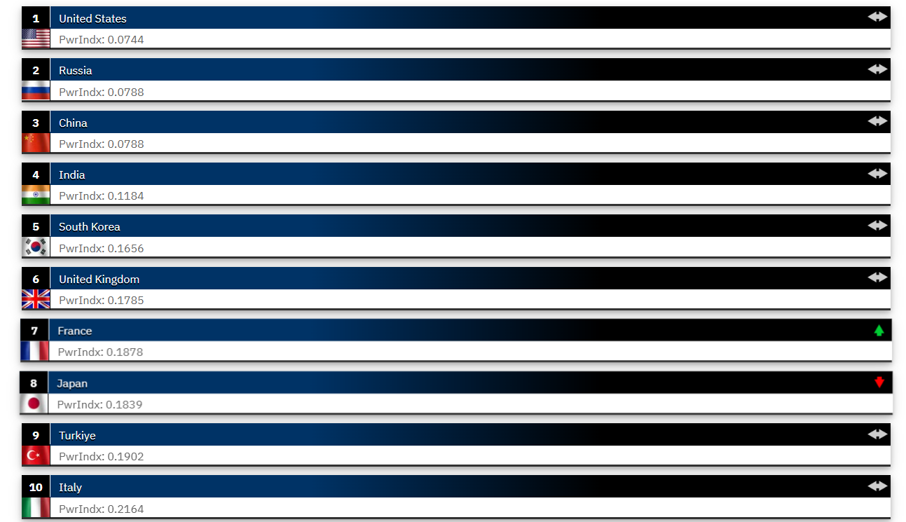 İlk dört sırada yer alan ülkeler bu yıl da değişiklik göstermedi. 1. sırada ABD, 2. sırada Rusya, 3. sırada Çin ve 4. sırada Hindistan yer almaya devam etti. Türkiye, son 20 yıldır 11. ile 9. sıra arasında kendine yer buluyor. Bununla birlikte, dünya genelindeki ülkelerin silah sanayisine verdiği önem, ordu güçlerinin artmasına katkıda bulunuyor.