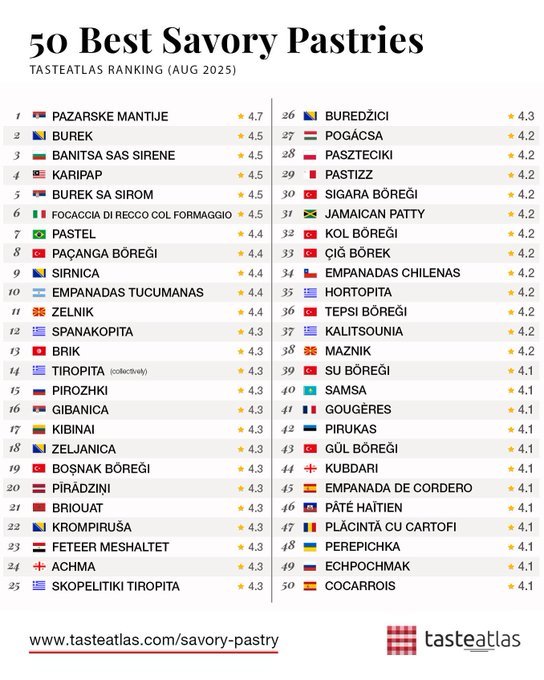 Yiyecek ve içecek kültürü listeleri ile bilinen TasteAtlas, Ağustos 2025 güncellemesiyle “En İyi 50 Tuzlu Hamur İşi” listesini açıkladı.