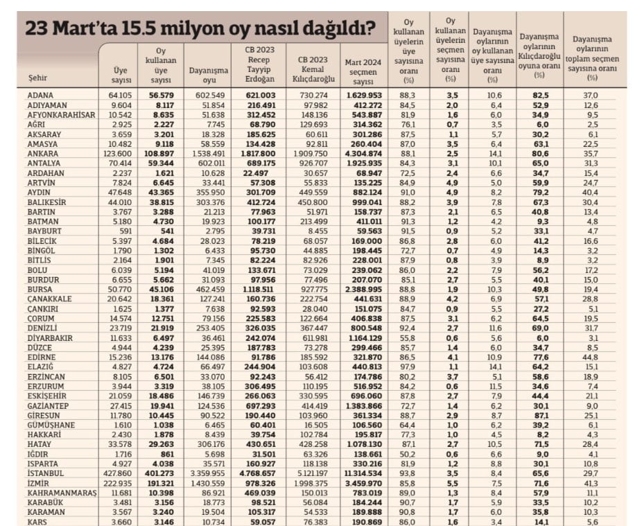 Daha da ilginç olan ise, 31 Mart 2024 yerel seçimlerinde CHP’nin yerel meclis oylarının 15.785.662 olmasıdır. Bu da gösteriyor ki, hemen hemen aynı sayıdaki seçmen, bu kez rızasıyla olanlara ve iktidara duyduğu tepkiyi, İmamoğlu’ndan yana duruşuyla göstermiş oldu.