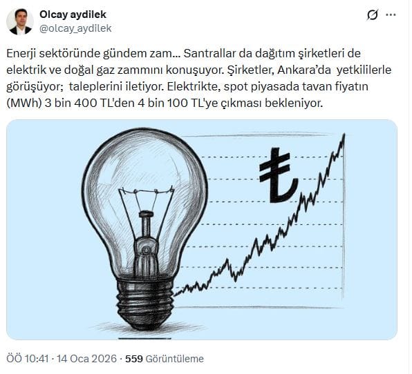 Aydilek’in sosyal medya platformu X hesabından yaptığı paylaşımda, “Enerji sektöründe gündem zam… Santrallar da dağıtım şirketleri de elektrik ve doğal gaz zammını konuşuyor. Şirketler, Ankara’da yetkililerle görüşüyor; taleplerini iletiyor. Elektrikte, spot piyasada tavan fiyatın (MWh) 3 bin 400 TL’den 4 bin 100 TL’ye çıkması bekleniyor” ifadeleri yer aldı.