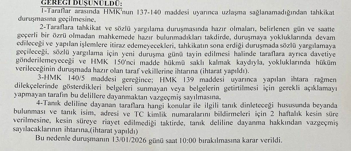 Anadolu 51. Asliye Hukuk Mahkemesi tarafların “uzlaşamaması” üzerine sözlü duruşmaya geçilmesine hükmetti.