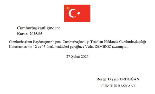 28 Şubat 2025 tarihli Resmi Gazete kararları yayımlandı. Cumhurbaşkanı Recep Tayyip Erdoğan imzasıyla yayımlanan Resmi Gazete’de Cumhurbaşkanlığı Başdanışmanlığına iki yeni atama yapıldı.