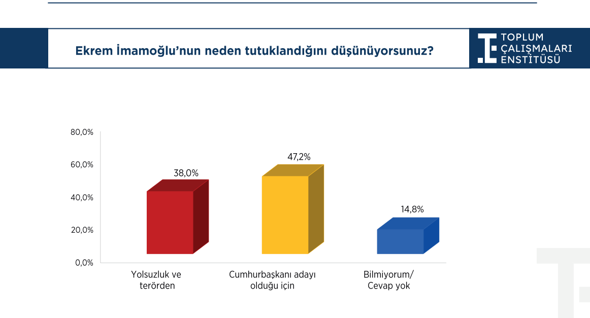 Erken seçim isteyenlerin oranı yüzde 52 olurken CHP’nin cumhurbaşkanı adayı görevden alınan Türkiye Belediyeler Birliği ve İstanbul Büyükşehir Başkanı Ekrem İmamoğlu’nun tutuklanmasını büyük çoğunluk “siyasi” olarak değerlendirdi.