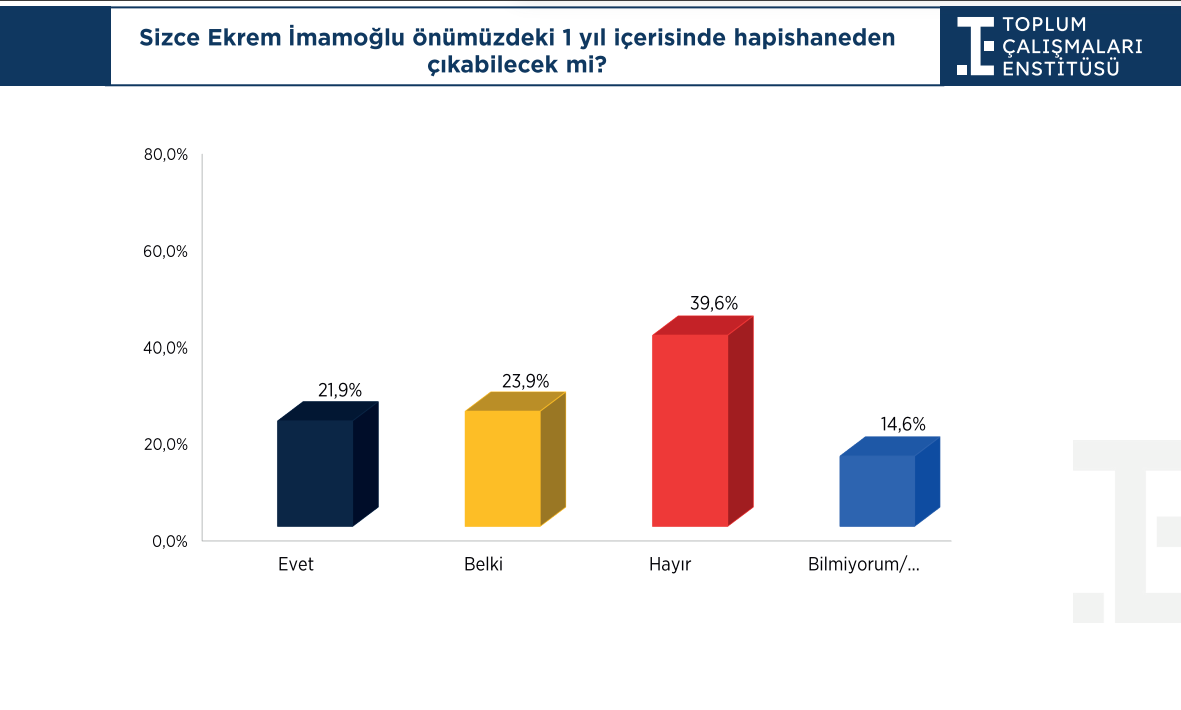 “Ekrem İmamoğlu’nun önümüzdeki bir yıl içerisinde hapishaneden çıkabilecek mi?” sorusuna yüzde 39.6 “hayır”, yüzde 21.9 “evet”, yüzde “23.9” belki, yüzde 14.6″ ise bilmiyorum yanıtını verdi.
