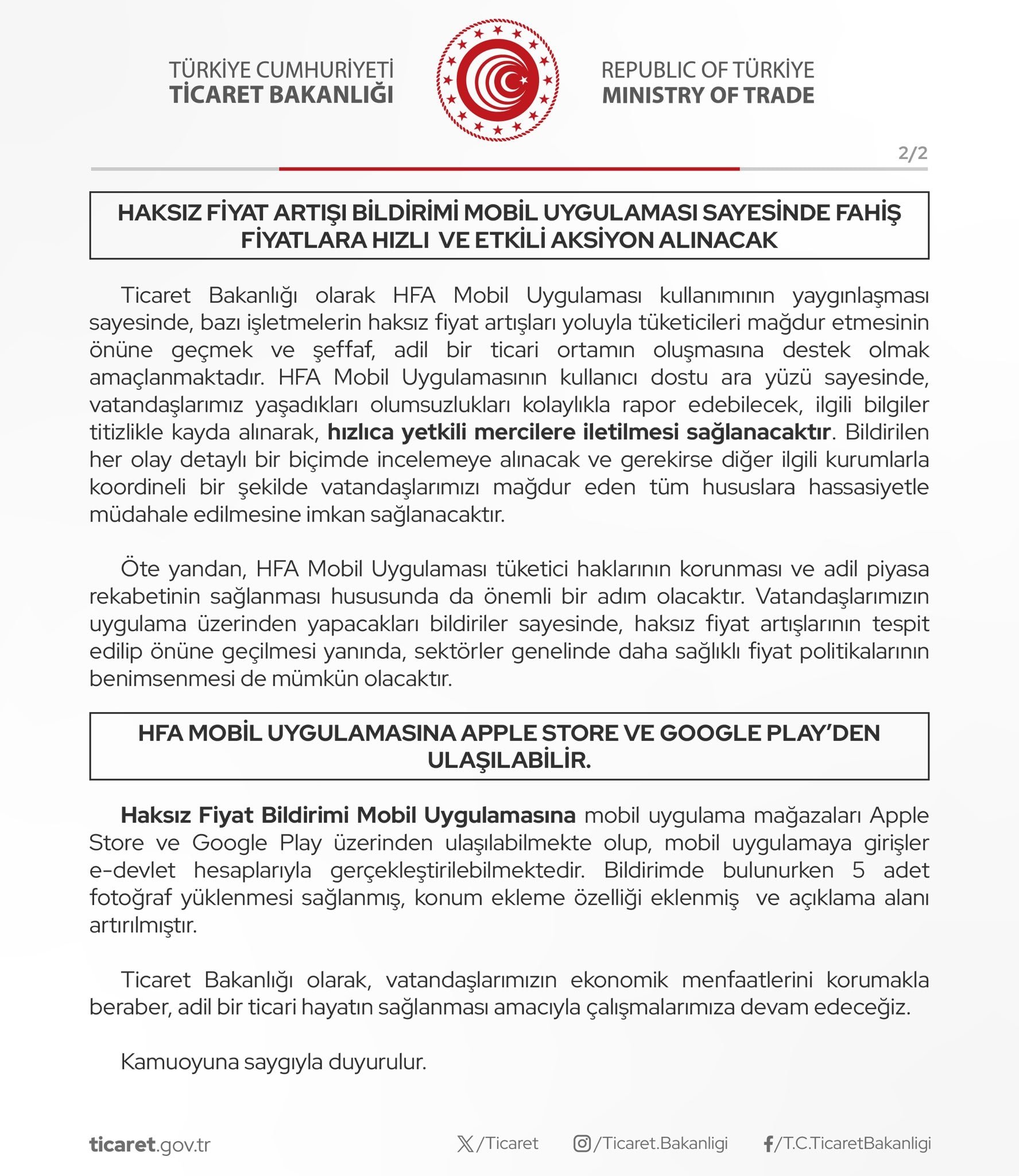 Bakanlıktan yapılan açıklamada, söz konusu mobil uygulamanın kullanımının yaygınlaştığına işaret edilerek, bazı işletmelerin haksız fiyat artışları yoluyla tüketicileri mağdur etmesinin önüne geçilmesinin ve şeffaf, adil ticari ortamın oluşmasına destek olunmasının amaçlandığı belirtildi.