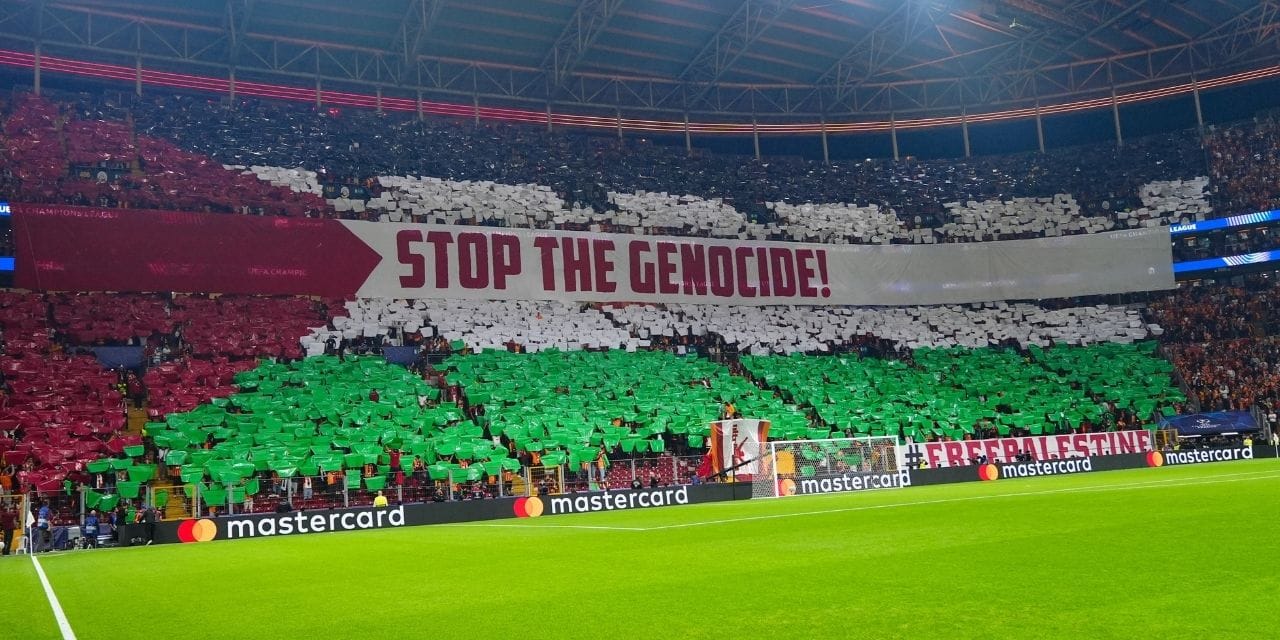 Sarı kırmızılı taraftarlar Gazze’deki insanlık dramına dikkat çektiler ve Filistin bayrağı açarak üstüne de İngilizce “Soykırımı durdurun” diye yazdılar.