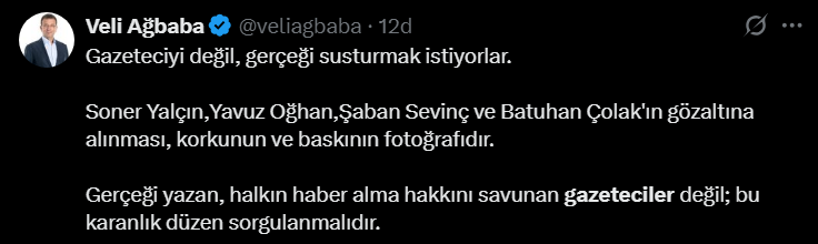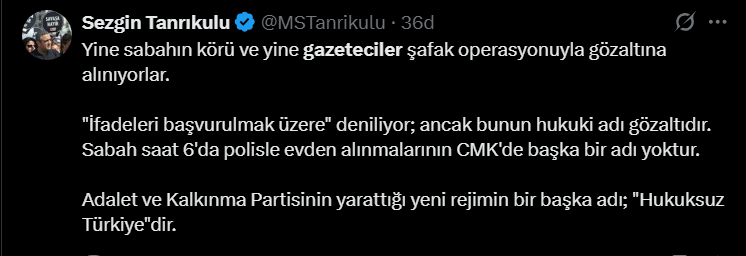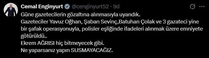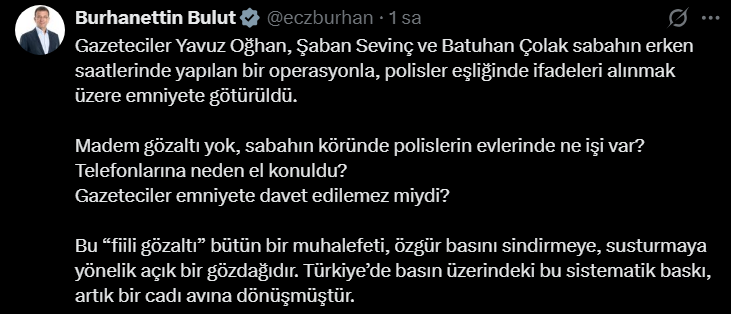 Başsavcılık, gazeteciler Yavuz Oğhan, Şaban Sevinç, Odatv İmtiyaz Sahibi Soner Yalçın, Aykırı Genel Yayın Yönetmeni Batuhan Çolak, Aslı Aydıntaşbaş ve Medyascope.tv’nin Kurucu Yayın Yönetmeni Ruşen Çakır hakkında gözaltı kararı verildiğini duyurdu.