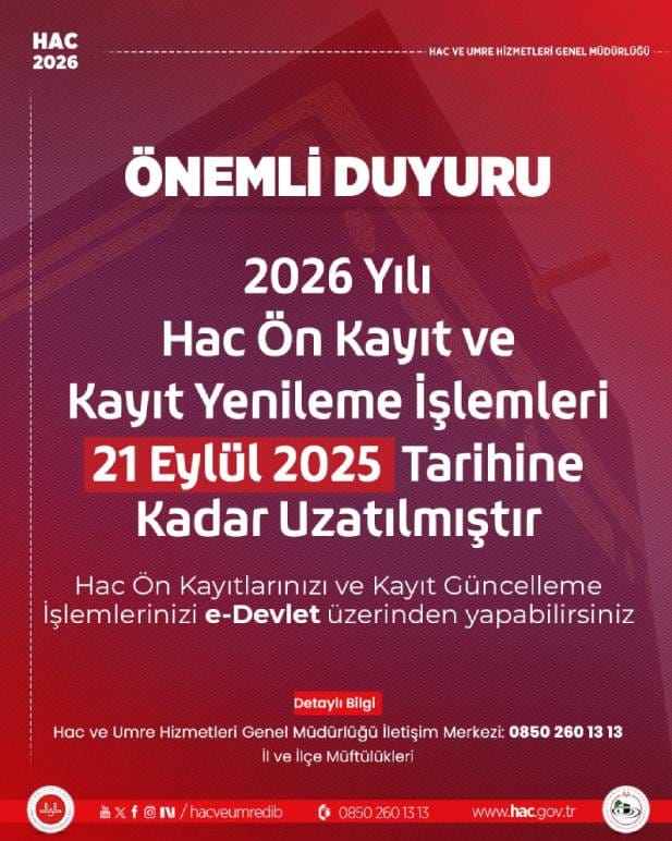 “2026 yılı hac ön kayıt ve kayıt güncelleme işlemleri vatandaşlarımızdan gelen yoğun talep üzerine 21 Eylül 2025 tarihine kadar uzatıldı. Vatandaşlarımız işlemlerini 21 Eylül 2025 tarihine kadar e-Devlet üzerinden yapabilirler”