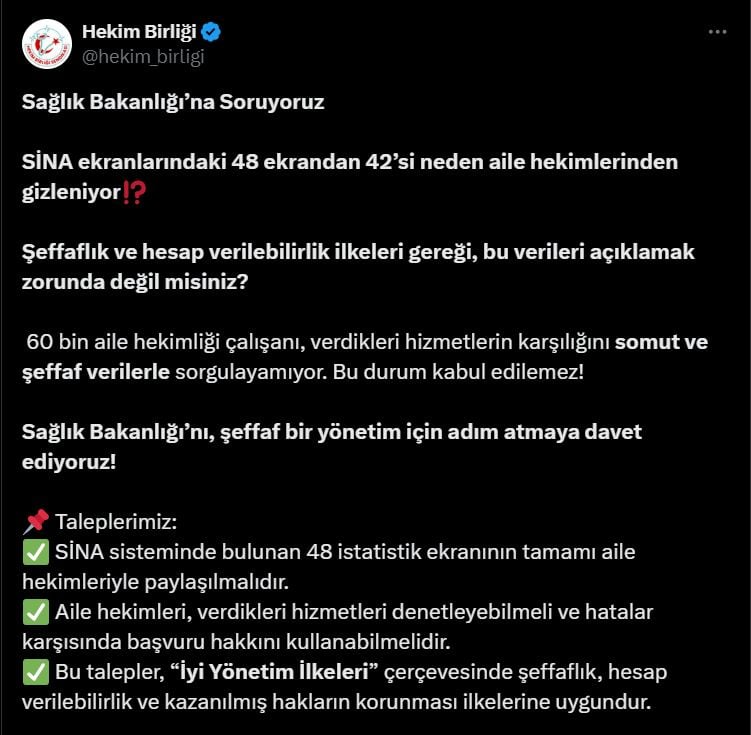 Hekim Birliği Sendikası’nın bakanlığa yönelik şeffaflık çağrısında bulunulan paylaşımında şu ifadelere yer verildi:
