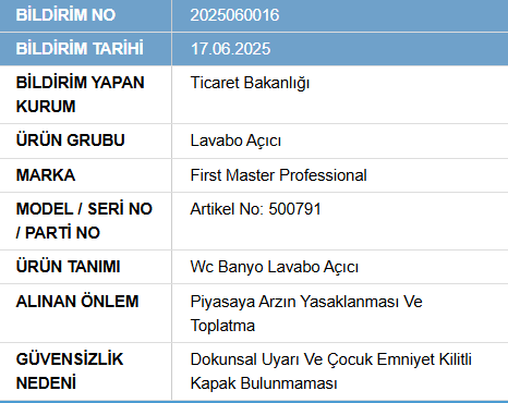 Bakanlık sağlığı tehdit eden bir ürünü daha platformda paylaştı. Kocaeli Gebze’de üretilen “First Master Professional” markalı WC banyo lavabo açıcının içerisinde kimyasal madde tespit edildi.