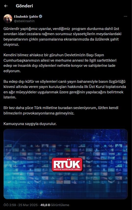 Şahin, ayrıca “Erdoğan’a hakaret” gerekçesiyle kanalları bir kez daha tehdit etti. “Günlerdir yaptığımız uyarılar, verdiğimiz program durdurma dahil üst sınırdan idari cezalara rağmen sorumsuz siyasetçilerin meydanlardaki beyanatlarının çirkin yansımalarına ekranlarımızda da üzülerek şahit oluyoruz” diyerek, ilk üst kurul toplantısında en ağır yaptırımların uygulanacağını belirtti.