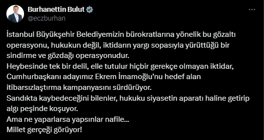 19 Mart tarihinden bu yana devam eden soruşturmalara bu sabah bir yenisi daha eklendi. 22 kişi hakkında verilen gözaltı kararına CHP’den ilk tepki Burhanettin Bulut’tan geldi. Bulut sosyal medya hesabından yaptığı açıklamada iktidarın, cumhurbaşkanı adayı İmamoğlu’nu itibarsızlaştırma kampanyasına devam ettiğini ifade etti: