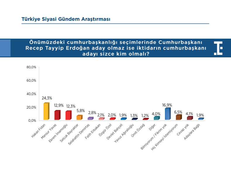 Katılımcılara, “Önümüzdeki cumhurbaşkanlığı seçimlerinde Cumhurbaşkanı Recep Tayyip Erdoğan aday olmazsa, iktidarın cumhurbaşkanı adayı sizce kim olmalıdır?” şeklinde bir soru yöneltilmiştir.
