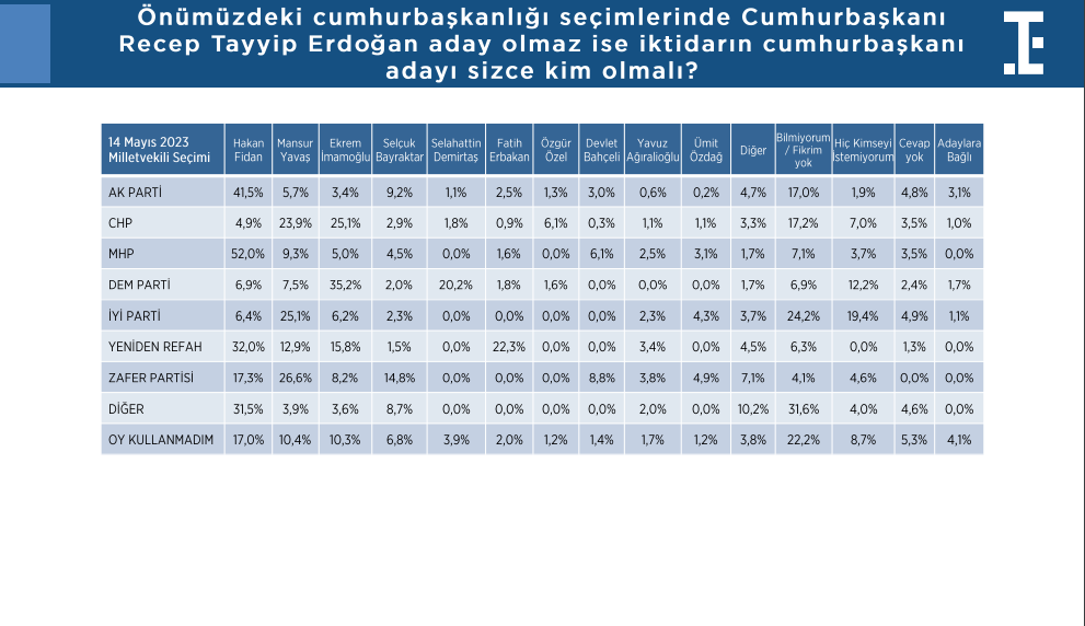 Anket sonuçlarına göre, Dışişleri Bakanı Hakan Fidan, %24,3 ile en yüksek oyu alarak ilk sırada yer alırken; Ankara Büyükşehir Belediye Başkanı Mansur Yavaş, %12,9 ile ikinci sırada, İstanbul Büyükşehir Belediye Başkanı Ekrem İmamoğlu ise %12,3 ile üçüncü sırada yer almıştır. Selçuk Bayraktar, %5,8’lik bir oranla dördüncü sırada bulunurken, eski HDP Eş Genel Başkanı Selahattin Demirtaş %2,8 ile son sırada yer almıştır.