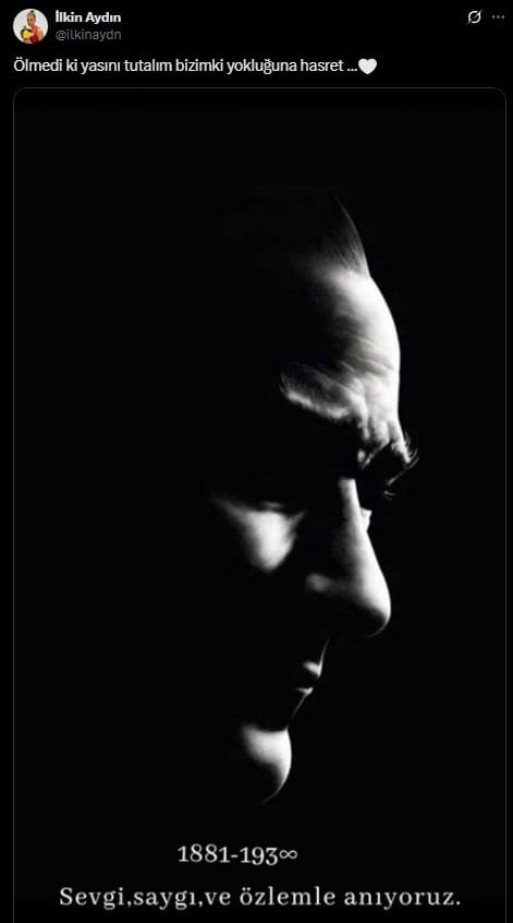 Atatürk’ün üzerinde “Sevgi, saygı ve özlemle anıyoruz” yazılı fotoğrafını paylaşan İlkin Aydın üstüne de kalp emojisiyle şu notu düştü: