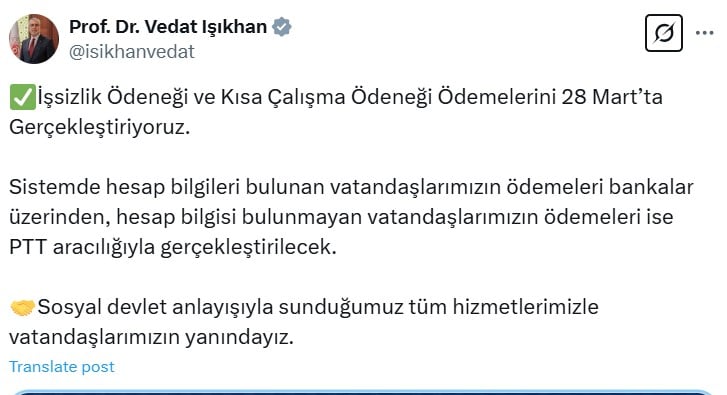 Çalışma ve Sosyal Güvenlik Bakanı Vedat Işıkhan, sosyal medya hesabından yaptığı paylaşımda, “Mart ayına ilişkin işsizlik ödeneği ve kısa çalışma ödeneği ödemelerinin, 2025 Mart ayının son iş günü olan 28 Mart 2025 Cuma gününden itibaren yapılmasına karar verilmiştir. Yarım çalışma ödeneği ve ücret garanti fonu ödemeleri de aynı tarihte gerçekleştirilecektir. Sistemde IBAN bilgileri bulunan vatandaşlarımızın ödemeleri bankalar üzerinden, IBAN bilgisi bulunmayan vatandaşlarımızın ödemeleri ise PTT aracılığıyla gerçekleşecektir. Sosyal devlet anlayışıyla sunduğumuz tüm hizmetlerle vatandaşımızın yanındayız” dedi.