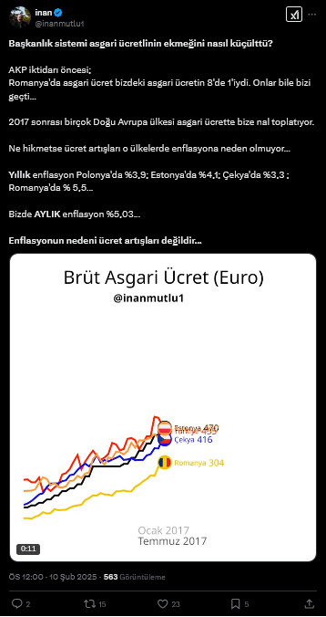 Asgari ücrete gelen zamların enflasyonu artırmadığını da belirten Mutlu, “Yıllık enflasyon Polonya’da %3,9; Estonya’da %4,1; Çekya’da %3,3 ; Romanya’da % 5,5… Bizde AYLIK enflasyon %5,03…” ifadelerini kullandı.