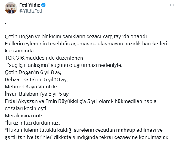 Çetin Doğan ile Behzat Balta, Mehmet Kaya Varol, İhsan Balabanlı, Erdal Akyazan ve Emin Büyükkılıç’a verilen cezalar 20 Mart’ta kesinleşti.