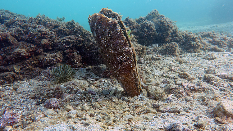 Kıyı dolgularından kendini kurtarabilmiş küçücük bir alanda hem deniz çayırı hem de oldukça yoğun Pinna nobilis popülasyonuna rastlandı.