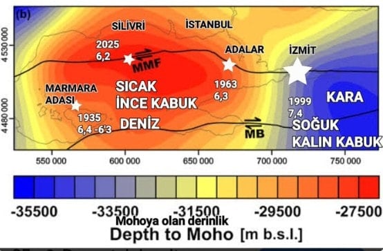 Haritada mavi ile işaretlenen kara alanlarında ise yer kabuğu daha kalın (yaklaşık 17 km) ve soğuk. Bu durum, fayları kilitliyor ve enerji birikiminin aniden boşalmasıyla, 1999 İzmit Depremi gibi 7’den büyük depremlere yol açıyor.