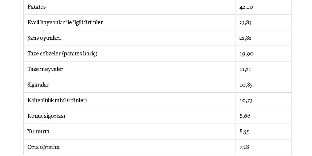 TÜİK’in açıkladığı verilere göre, mart ayında en çok patates zamlandı. Yüzde 42,1 oranında fiyat arttıran patatesi, yüzde 23,85 ile evcil hayvanlarla ilgili ürünler, yüzde 22,82 ile şans oyunları takip etti.