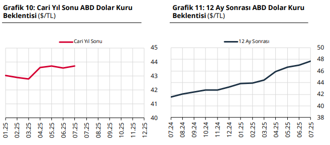 Katılımcıların cari yıl sonu döviz kuru (ABD Doları/TL) beklentisi bir önceki anket döneminde 43,57 TL iken, bu anket döneminde 43,72 TL oldu.12 ay sonrası döviz kuru beklentisi ise bir önceki anket döneminde 47,04 TL iken, bu anket döneminde 47,70 TL olarak gerçekleşti.