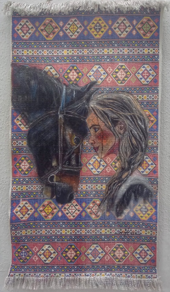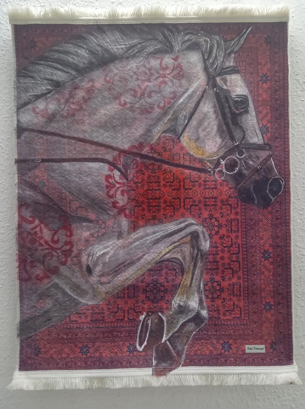 Bu sergide beni etkileyen iki olayı sizlerle paylaşmak isterim. Birincisi, sanatçının 15 yıllık bazı çalışmalarını, kendi tekniği ile ‘karton’ ve ‘halı’ üzerine yapmasıdır. Şimdiye de bu iki tür malzeme üzerine yapılmış eseri görmediğim için bana çok ilginç geldi.